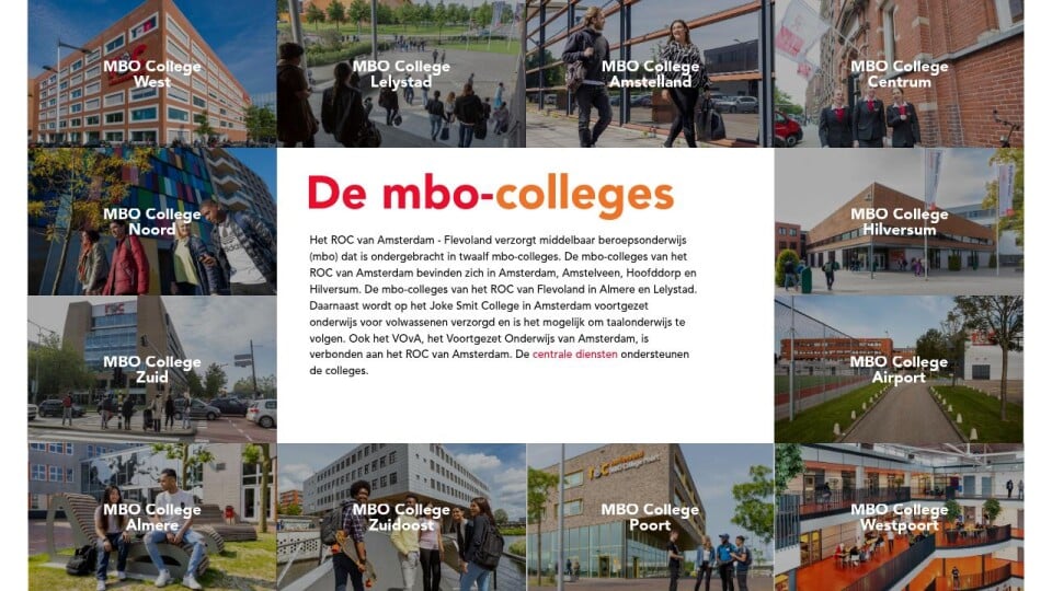Het ROC van Amsterdam - Flevoland verzorgt middelbaar beroepsonderwijs (mbo) dat is ondergebracht in twaalf mbo-colleges. De mbo-colleges van het ROC van Amsterdam bevinden zich in Amsterdam, Amstelveen, Hoofddorp en Hilversum. De mbo-colleges van het ROC van Flevoland in Almere en Lelystad. Daarnaast wordt op het Joke Smit College in Amsterdam voortgezet onderwijs voor volwassenen verzorgd en is het mogelijk om taalonderwijs te volgen. Ook het VOvA, het Voortgezet Onderwijs van Amsterdam, is verbonden aan het ROC van Amsterdam. De centrale diensten ondersteunen de colleges.